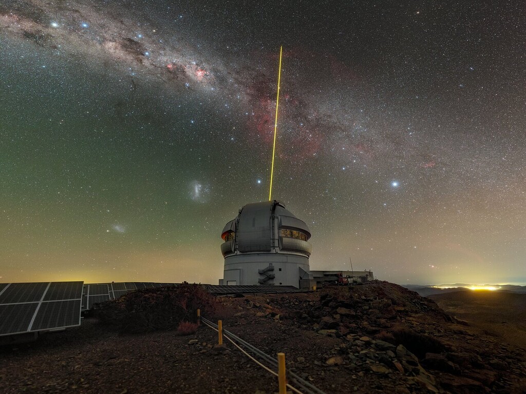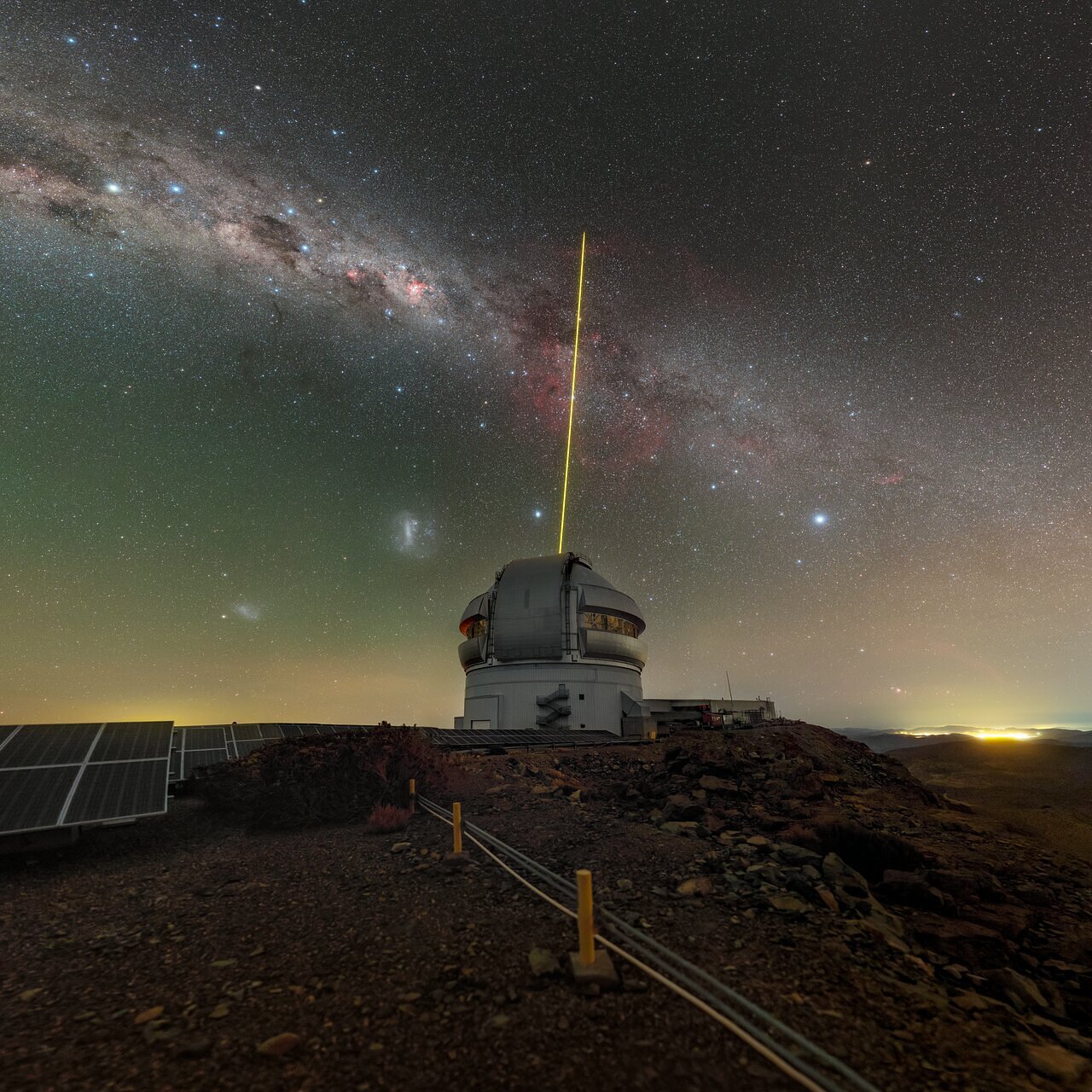 Mléčná dráha se vine noční oblohou jižní polokoule na této fotografii observatoře Gemini South, která tvoří jednu polovinu Mezinárodní observatoře Gemini. Gemini South je částečně podporována americkou Národní vědeckou nadací (NSF) a provozována organizací NSF NOIRLab. Nachází se na vrcholu hory Cerro Pachón v Chile, známé svými ohromujícími tmavými nočními nebesy. Na fotografii provozuje svou soustavu pěti laserových naváděcích hvězd, které slouží pokročilému systému adaptivní optiky ke snížení rozmazání obrazů způsobeného zemskou atmosférou.